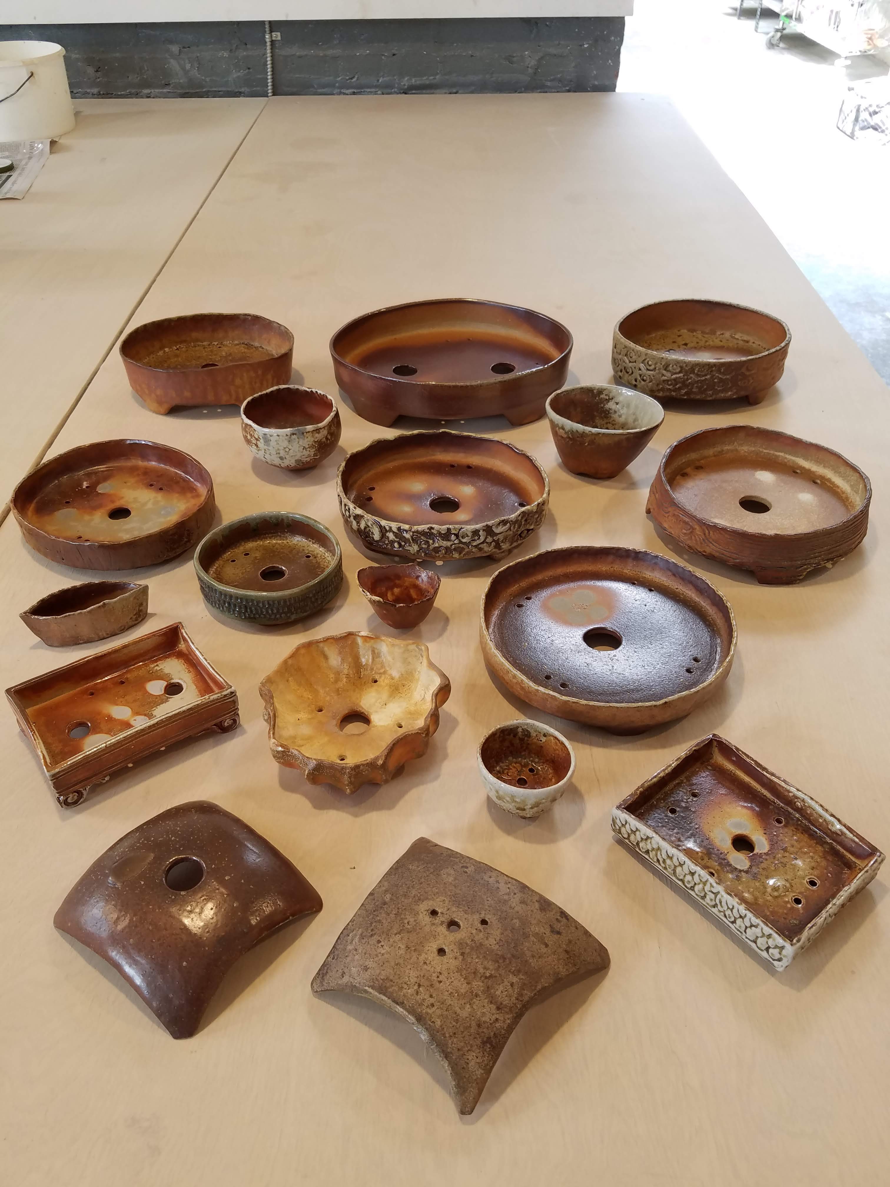 Bonsai pots covered in clay slip, with wadding on their feet, are waiting to be loaded in the wood-fire kiln.